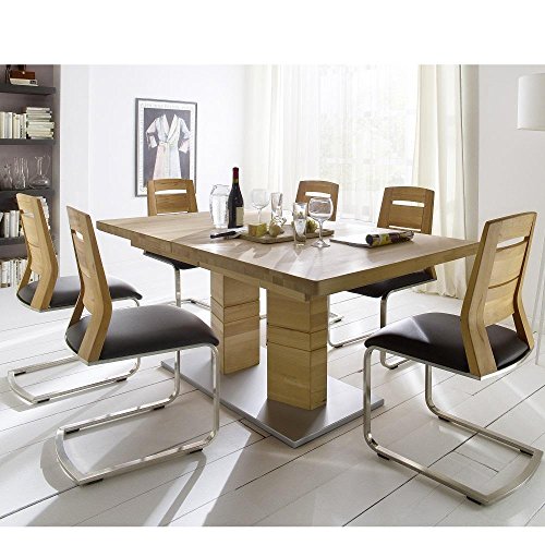PRODUCT DESCRIPTIONS:Your home's dining room is the place where magic happens. Where you, your family and your friends enjoy some of the best moments in life. Make it also one of the most beautiful and fashionable places in your house.Our London Extendable Dining Table will help you create the ideal dining room where you will find the required comfort and inspiration. The modern design rectangular extendable top is made of core beech supported by two columns set on a silver base. Eight exclusive design chairs with solid oak wood back, stainless steel frame and brown coloured polyurethane seat complement the table to create a striking look.The natural wooden colour and unique design make it possible to combine with similar style living room furniture.•Core Beech With Silver Base•Material table & column: Solid Wood Core Beech, oiled and waxed floor panel: MDF (medium density fibreboard), painted•Table top & Frame: Core Beech•Baseplate: Silver•Thickness: 50 mm table edge doubled•2 inner extension leaves 40 cm•Fresh Design for Living & Dining Room•Classic rectangle Shape with a modern look•Sturdy construction•Ideal For Dining Room And Kitchen Area•Easy-care and durable surface