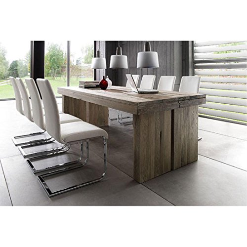 PRODUCT DESCRIPTIONS:A perfect combination of rustic and modern wooden table top. This dining table set will feel at home in a modern décor setting as well as in a more rustic decoration style. The Wooden Finish table top is set on four flat wooden legs that perfectly combine with the top. All wooden surfaces retain a natural look and feel that results in a unique style. The set combines with eight faux leather chairs set on a flat tube chrome structure. Both the table and the chairs are available in different colour combinations.This exquisite set will bring a new, different look to your dining room and house.•Veronica 220cm Dining Table In Wooden Finish With Wooden Legs•Wooden Finish•The Dining Table Wooden Material is sourced from all over Europe that will be used in manufacturing•Cracks, Dents, Branches, Holes and Colour differences are intentional and result the uniqueness of the tables•Highest quality furniture from a respected manufacturer•Strong And Sturdy Wooden Legs Gives the Stability•8 Hublot Metal Swinging Faux Leather Dining Chair•Flat tube Chrome Base•For your piece of mind know only the best materials & construction methods were used