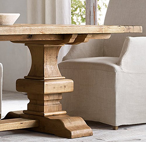 PRODUCT DESCRIPTIONS:Reclaimed Hampton oak dining table Handcrafted of solid reclaimed oak timbers from decades-old buildings in Great Britain, our trestle-style table draws from a tradition of dining and banqueting furnishings that dates to the 17th century. Product details... • Handcrafted of finished, solid salvaged oak timbers from 100-year-old buildings in Great Britain, 45mm solid oak tops- very heavy and strong • Rough-hewn salvaged oak planks, which will vary somewhat in colour and grain, are carefully hand-selected, planed and lightly hand sanded, yet may show marks of previous use • Finished, sealed salvaged oak bears a timeworn patina and includes distinctive nicks, splits, cracks, knots and imperfections that speak of the wood's age and provenance. Salvaged wood will continue to change over time as it interacts with its home environment, and will age beautifully. • Handsomely distressed and generously sized to accommodate large gatherings • By their nature, sealed salvaged oak may be somewhat uneven and may cup or bow over time due to changes in temperature or humidity. We believe this only enhances the table's rustic, unique character. • This item is artisan-crafted with meticulous care. Given its handmade and hand-finished nature, variations and imperfections in the wood are to be expected and celebrated. Each salvaged item is an original and no two pieces are exactly alike. • Care: Wipe using a damp cloth with mild soap and water, followed by a dry cloth. Wipe spills up immediately with a dry cloth. • For dining tables, use of tablecloths, placemats and coasters is recommended to prevent staining. All of our tables are finished in Osmo Polyx Oil® that makes the oak stain resistant and water repellent, keeping your table safe from the likes of red wine and cola. We also add a wax to help protect the table further upon delivery.