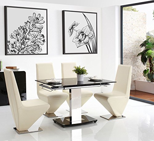 PRODUCT DESCRIPTIONS:Looking for a compact but versatile dining solution for your home? Look no further than the stunning Enzo black glass extending dining table. The Enzo is made of 12mm thick tempered glass with a central stainless steel pillar frame set on top of a black glass base. The glass on both the table top and base is finished with bevelled edges. Fully extended the table measures 120cm in length enabling 6 people to be seated. The fixed surface area measures 80cm x 80cm giving you a compact space saving solution when you don't need to entertain guests. Accompanying the table are the stunning Rita faux leather dining chairs available in black or ivory. The Rita dining chairs are an exclusive design, featuring a subtly angled back and geometric style seat set on top of a flat polished stainless steel base. The seat and back rest are padded for a comfortable dining experience.Please Note: These Chairs come flat packKey Features: •12mm thick toughened glass - fully tempered •Bevelled edges on all glass •2 extension panels - with simple to use mechanism for maximum convenience •Sturdy polished stainless steel frame •Adjustable feet for uneven floors •This item has been designed with minimal home assembly needed to aid delivery to your home. Full instructions will be provided to ensure assembly process is straight forward